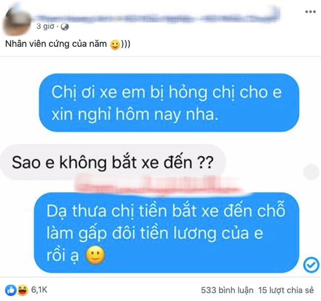 Cụ thể, thấy nam thanh niên này không đi làm, người quản lý có nhắn tin hỏi lý do thì nhận được một lý do khiến nhiều người "cạn lời" như sau: "Dạ thưa chị, tiền bắt xe đến chỗ làm gấp đôi tiền lương của em rồi ạ".