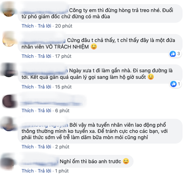 - Đồng cảm, nhà xa mà hôm nào dậy muộn, muộn chấm công là thôi nghỉ nguyên ngày, muộn 30 phút coi như không tính nửa ngày công thì ở nhà cho lành.