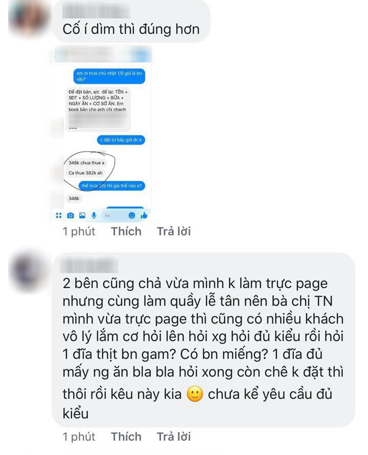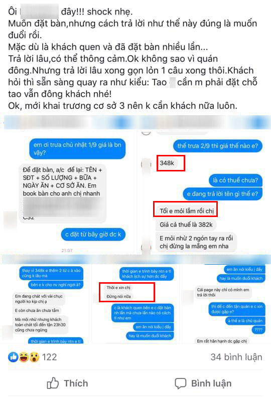 Tuy nhiên, đôi khi chỉ riêng việc đặt bàn thôi cũng gặp lắm vấn đề. Như mới đây, một cô gái rất bức xúc vì nhắn tin vào fanpage của cửa hàng buffet hải sản tiếng tăm ở Hà Nội để đặt bàn mà nhận câu trả lời trống không. "Ôi, nhà hàng P này! Sốc nhẹ! Muốn đặt bàn nhưng cách trả lời như thế này đúng là muốn đuổi khách đi rồi. Mặc dù là khách quen và đã đặt bàn nhiều lần. Trả lời lâu có thể thông cảm. Ok, không sao vì quán đông. Nhưng trả lời lâu xong gọn lỏn 1 câu xong thôi. Khách hỏi thì sẵn sàng quay ra kiểu: Tôi không cần cô phải đặt chỗ tôi vẫn đông khách nhé!" – facebook T.T.N tức giận viết.
