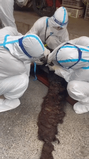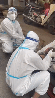 | Nhân viên y tế chật vật xử lý mái tóc nuôi lâu năm của ông cụ trước khi đưa đến nơi cách ly. |