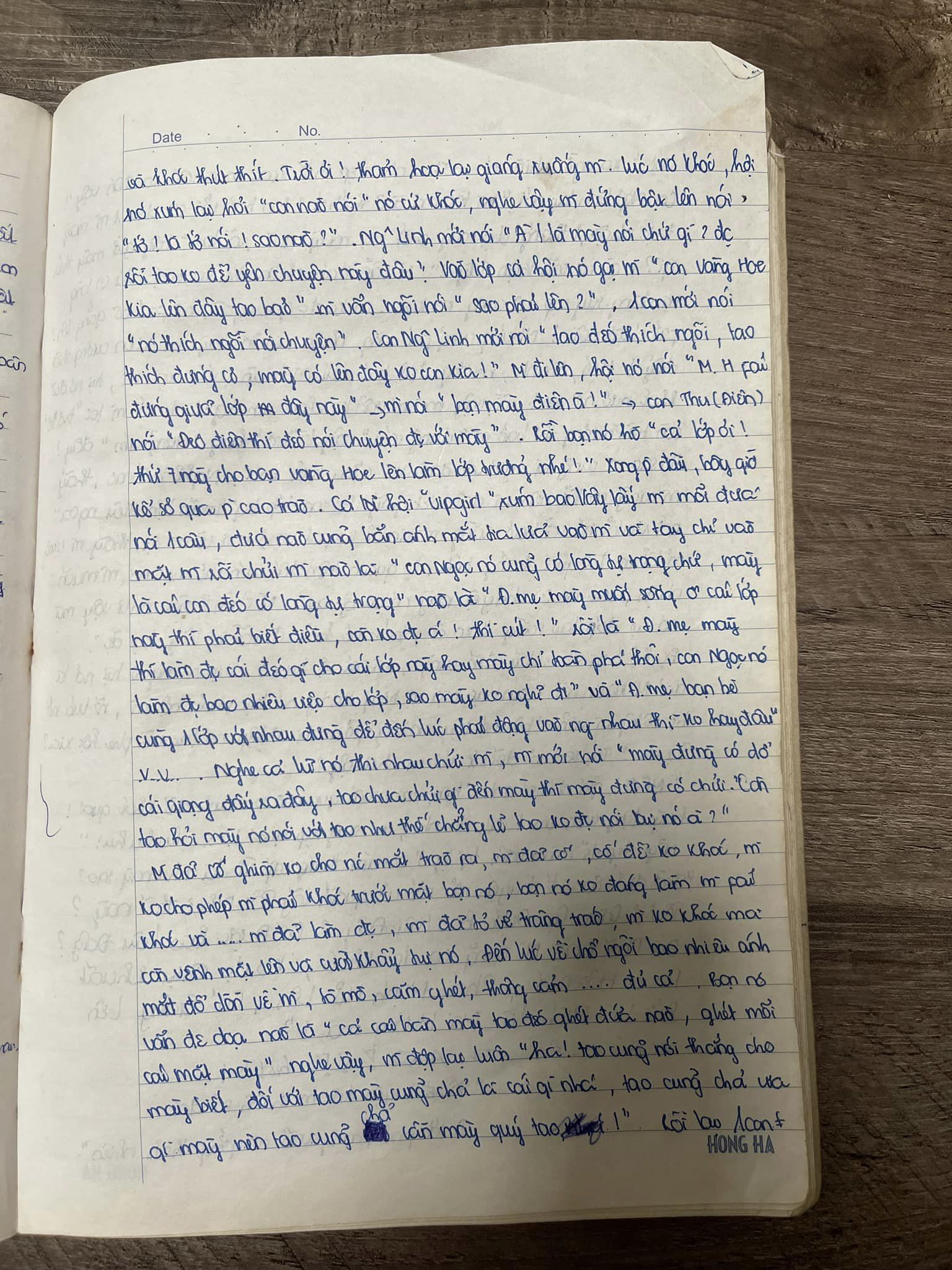 “Tôi uất nghẹn đến mức không thể giải thích một câu nào trước cô giáo. Tất cả cảm xúc dồn nén bao lâu bỗng dưng như quả bóng nổ tung. Tôi òa khóc nức nở không thể ngưng lại.
