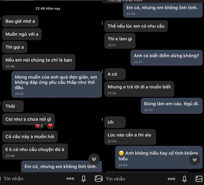 "Em không có nhu cầu chuyện đó à". Sau đó, anh ta liên tục gợi ý chuyện nếu cô cần đến mình thì gọi điện.