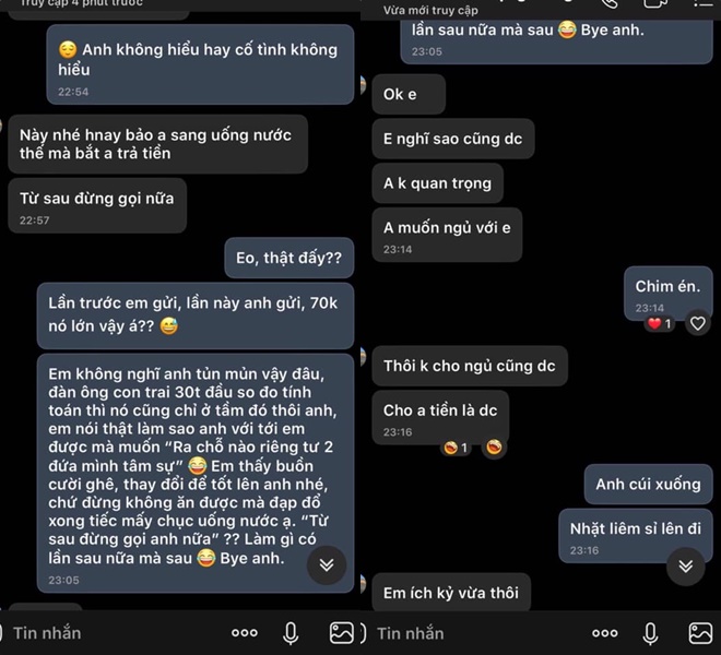 Chưa gạ gẫm được, người đàn ông ngoặt sang việc phải trả tiền bữa nước hôm nay và buông lời trách móc cô gái. Đến nước này, cô không nhịn nữa mà tỏ thái độ luôn. Cô cũng có ý định "cạch mặt" khách hàng này, không có lần sau gặp mặt nữa.