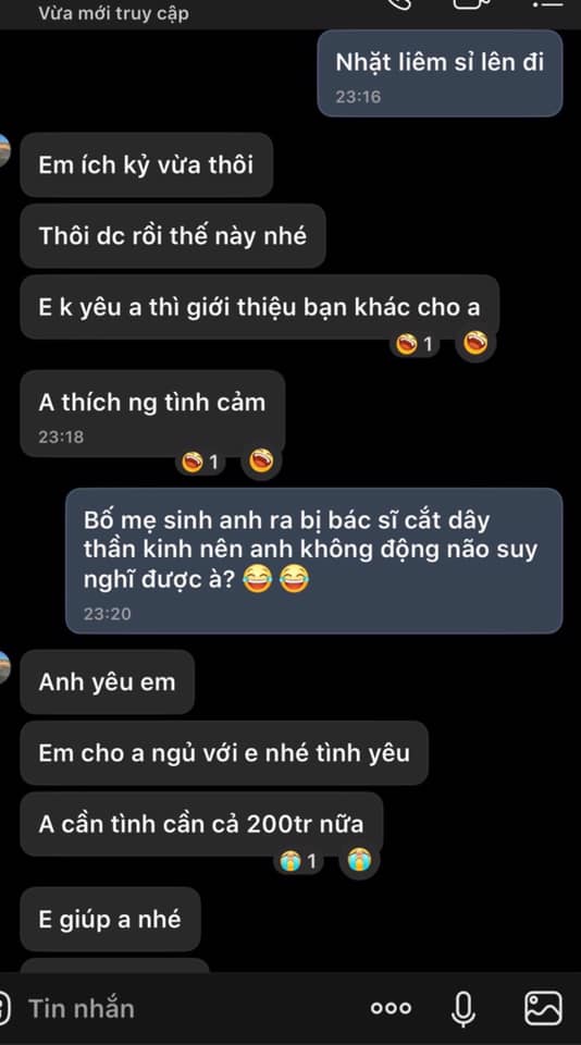 "Em ích kỷ vừa thôi. Em không yêu anh thì giới thiệu bạn khác cho anh. Anh yêu em, em cho anh ngủ với em nhé tình yêu. Anh cần tình, cần cả 200 triệu nữa", người đàn ông nhắn qua.