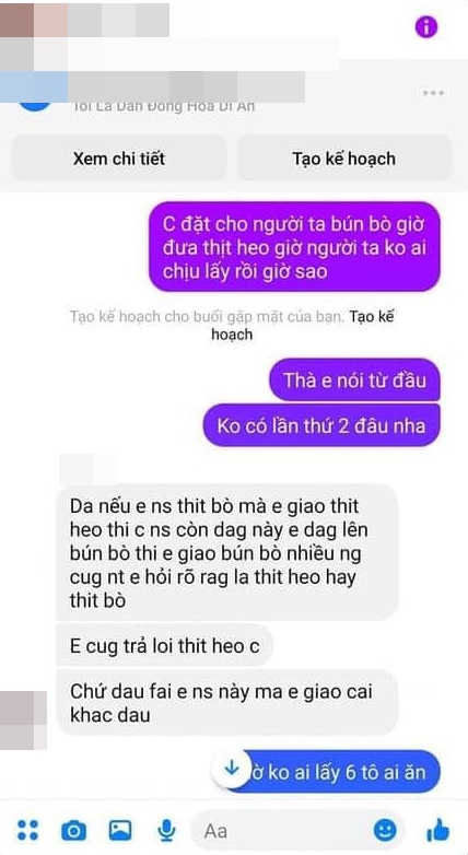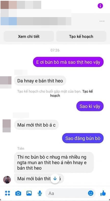 Theo đó, người bán hàng này còn quay ngược ra bắt bẻ khách hàng của mình: "Dạ nếu em nói thịt bò mà em giao thịt heo thì chị nói, còn đằng này em đăng lên bún bò thì em giao bún bò, nhiều người cũng nhắn tin hỏi rõ ràng là thịt heo hay thịt bò. Em cũng trả lời thịt heo chị".