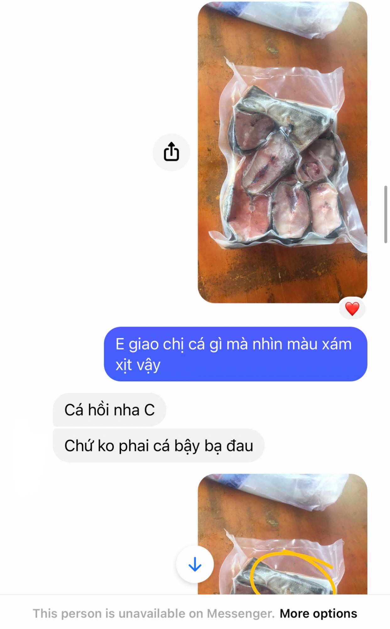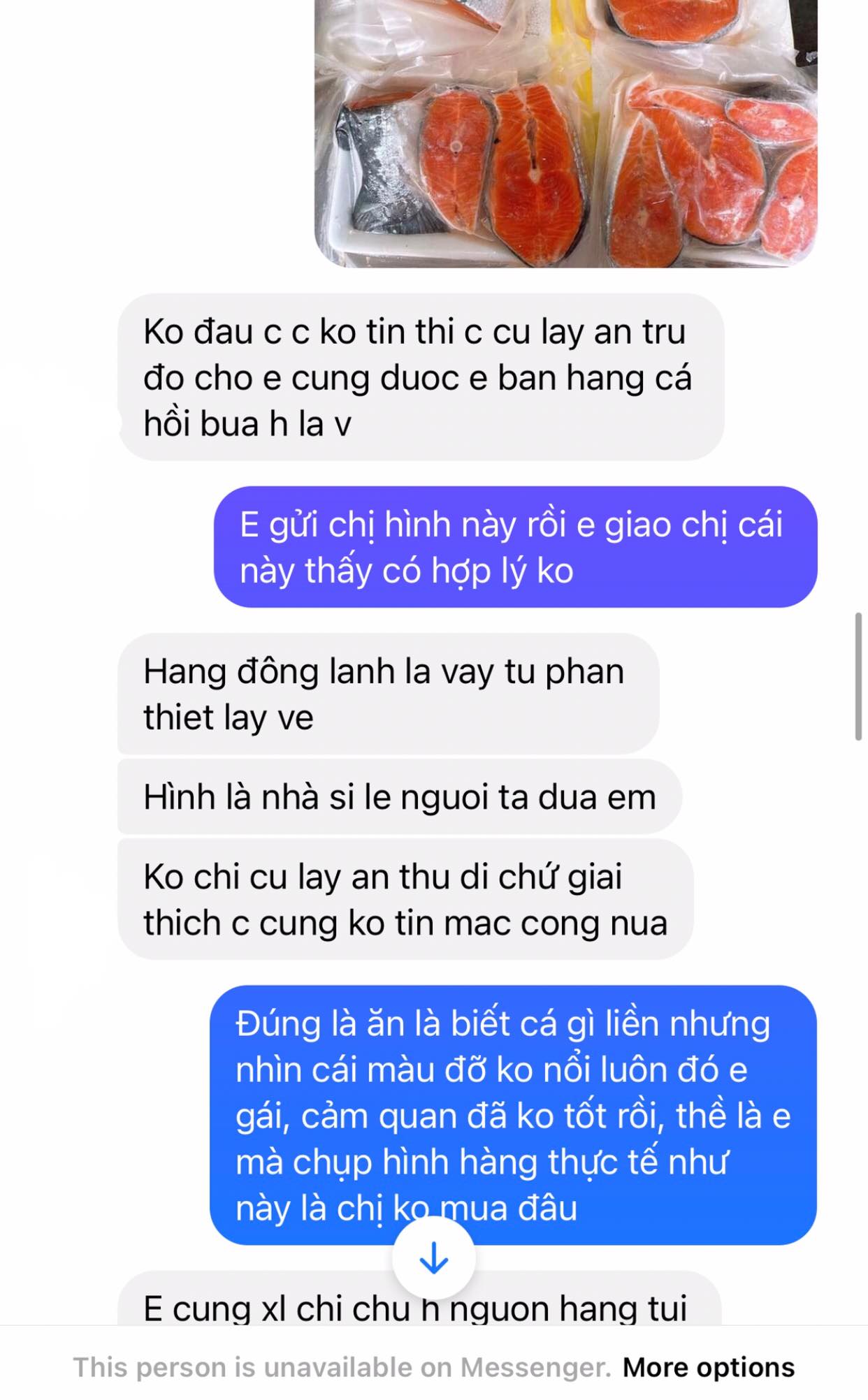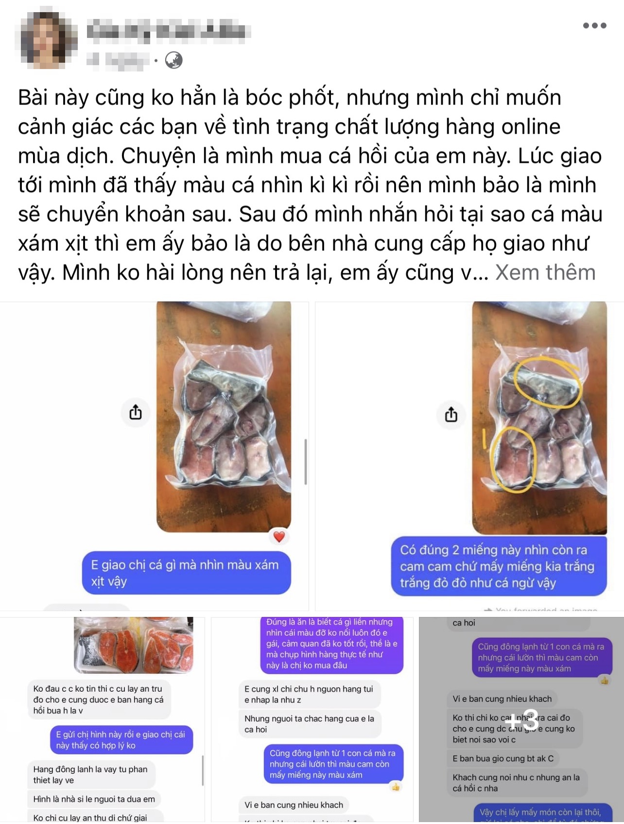 "Bài này cũng không hẳn là bóc phốt, nhưng mình chỉ muốn cảnh giác các bạn về tình trạng chất lượng hàng online mùa dịch. Chuyện là mình mua cá hồi của em này. Lúc giao tới mình đã thấy màu cá nhìn kì kì rồi nên mình bảo là mình sẽ chuyển khoản sau. Sau đó mình nhắn hỏi tại sao cá màu xám xịt thì em ấy bảo là do bên nhà cung cấp họ giao như vậy. Mình không hài lòng nên trả lại, em ấy cũng vui vẻ nhận hàng về. Mình chuyển tiền những món còn lại rồi thì em ấy đòi tặng mình vỉ cá không lấy tiền, mình nhất quyết không nhận nhưng em cố gắng thuyết phục mình cho bằng được và sau đó block mình luôn. Hôm sau mình xé ra thử thì công nhận chỉ có đúng 2 khúc là cá hồi, còn mấy khúc còn lại là cá gì mình không rõ. Vì thế mặc dù biết mọi người vẫn luôn cảnh giác nhau về việc mua hàng mùa dịch, nhưng mình vẫn muốn chia sẻ thêm câu chuyện của mình", tài khoản G.K (tên viết tắt) chia sẻ.