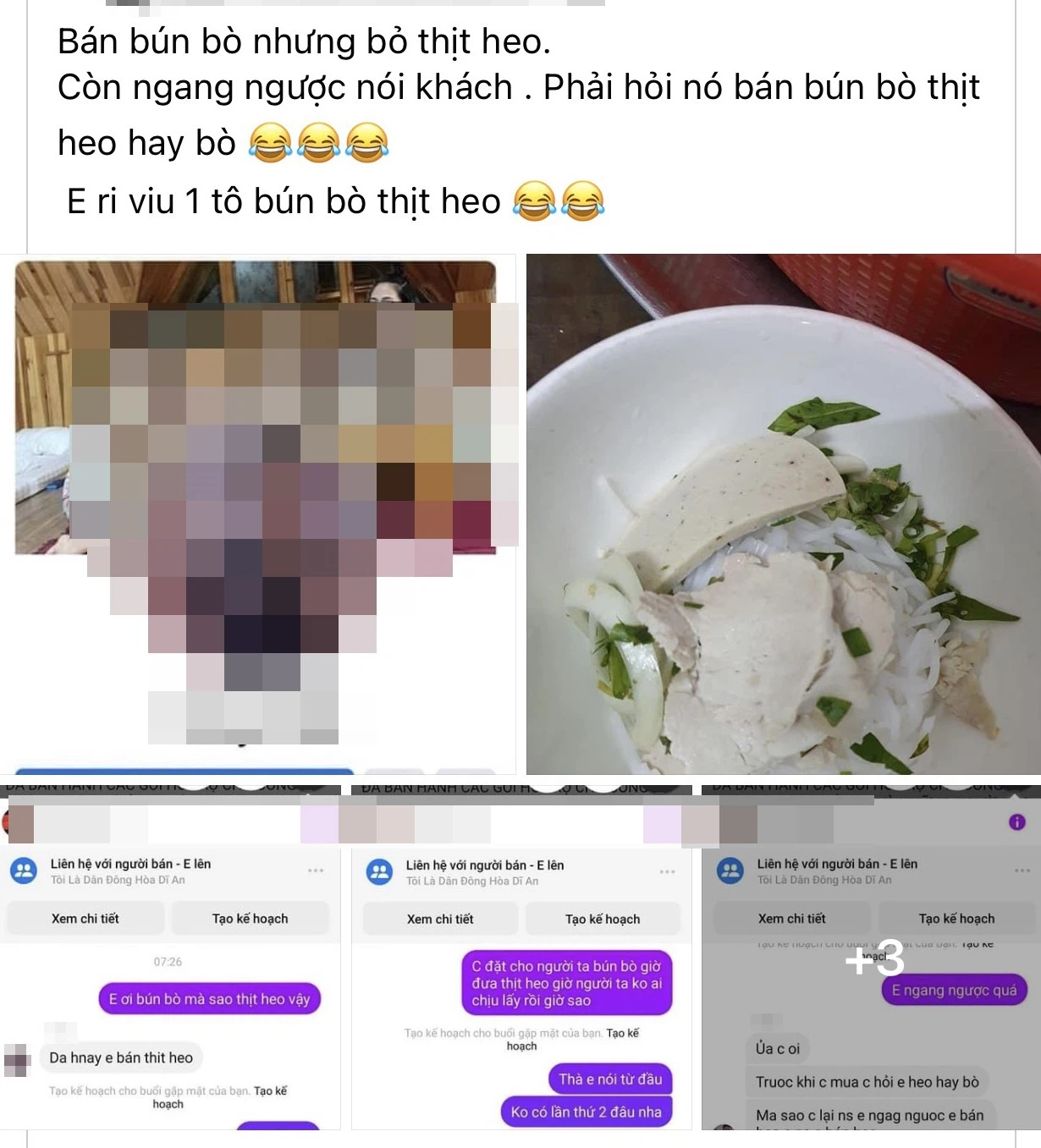 "Từ đầu mùa dịch đến giờ tôi toàn mua hàng online, cho dù người bán hàng có bán đồ hư tôi chỉ nhắn tin góp ý chứ không bóc phốt bất kì ai vì họ cũng khó khăn kiếm tiền trong mùa dịch. Sáng nay mua 5 tô bún riêu ở chùa K.A (tên viết tắt) về ăn mà tôi cảm thấy rất bực tức. Người bán đăng hình rõ ngon mà về nhà đổ ra miếng thịt thì mỡ, đã vậy ngay cả da heo bỏ vào cũng không hề làm sạch còn lông heo, vui lòng người bán nhìn lại dùm nha, tôi bỏ tiền ra thì cũng ăn cho đáng đồng tiền chứ không phải mùa dịch mà bán kiểu đó. Tôi không bốc phốt là để còn làm ăn chứ kiểu đó tôi đem lại tận nhà đó buôn bán có tâm và có đức xíu trong mùa dịch đi!", một khách hàng rất bức xúc khi nhận được đồ ăn kém chất lượng chia sẻ.