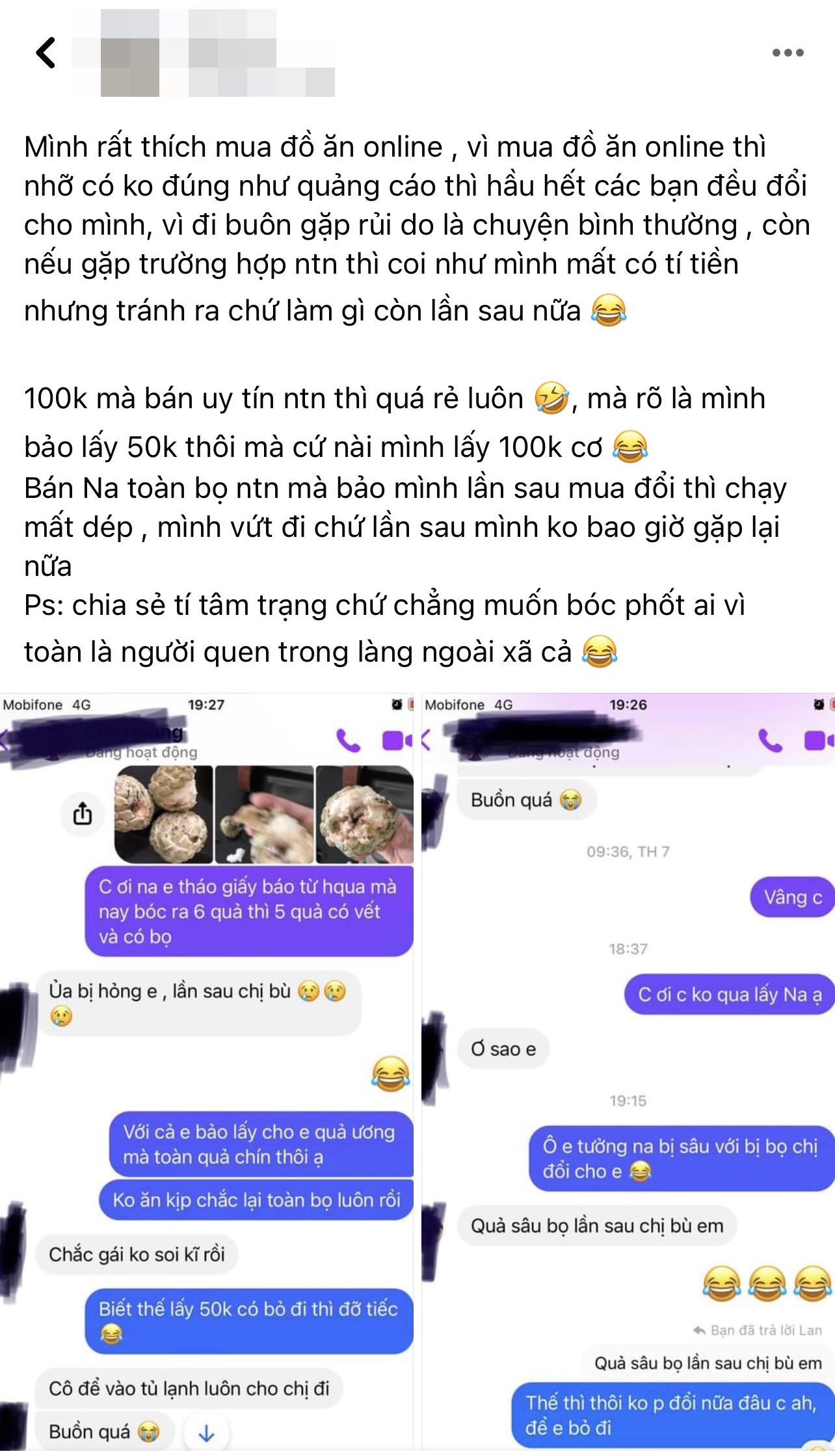 "Mình rất thích mua đồ ăn online, vì mua đồ ăn online thì nhỡ có không đúng như quảng cáo thì hầu hết các bạn đều đổi cho mình, đi buôn gặp rủi do là chuyện bình thường. Còn nếu gặp trường hợp như thế này thì coi như mình mất có tí tiền nhưng tránh ra chứ làm gì còn lần sau nữa. 100k mà bán uy tín như thế này thì quá rẻ luôn, mà rõ là mình bảo lấy 50k thôi mà cứ nài nỉ mình lấy 100k cơ. Bán Na toàn bọ mà bảo mình lần sau mua đổi thì chạy mất dép, mình vứt đi chứ lần sau mình không bao giờ gặp lại nữa".