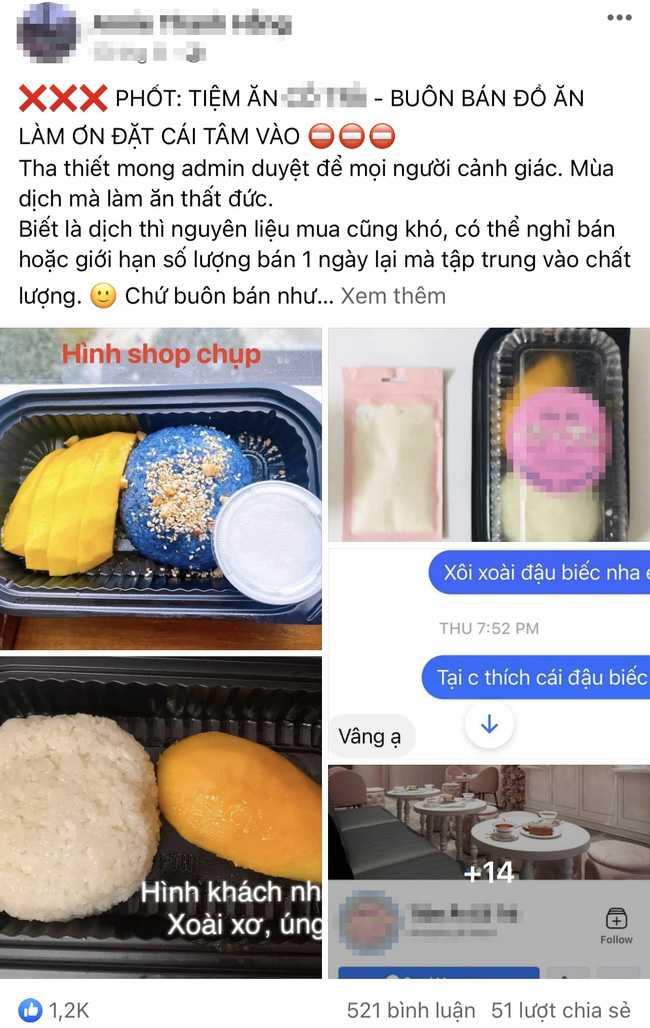 "Biết là dịch thì nguyên liệu mua cũng khó, có thể nghỉ bán hoặc giới hạn số lượng bán 1 ngày lại mà tập trung vào chất lượng, chứ buôn bán như thế này thì... Mọi người nhìn thử xem đồ ăn thực tế shop chụp và đồ ăn mình nhận có gì khác nhau không, từ màu sắc đến chất lượng. Hai phần xôi xoài đó mà 70k/phần, ăn xoài như bị úng. Ship từ quận 3 đến Phú Nhuận 60k, coi như bỏ 140k mua 2 cục xôi nếp. Mùa dịch kiếm tiền khó, cả khách-shop-shipper. Nếu mình không thương shipper thì mình đã trả lại rồi, vì chú già và mình sợ chú đã ứng tiền với bên đó..."