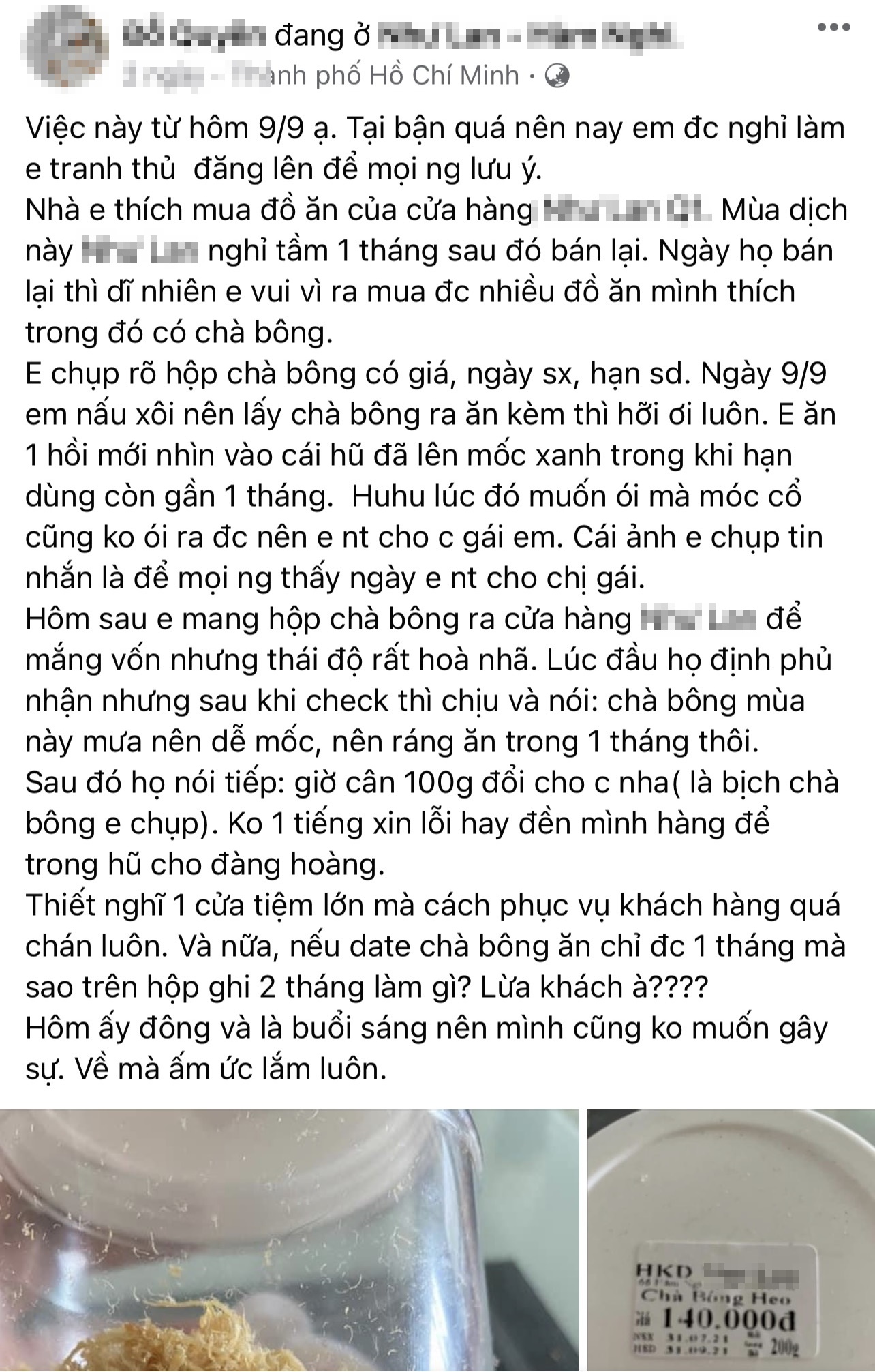 "...Em mang hộp chà bông ra cửa hàng để mắng vốn nhưng thái độ rất hòa nhã. Lúc đầu họ định phủ nhận nhưng sau khi check thì chịu và nói: "Chà bông mùa này mưa nên dễ mốc, nên ráng ăn trong 1 tháng thôi". Sau đó họ nói tiếp: "Giờ cân 100g đổi cho chị nha". Không một tiếng xin lỗi hay đền mình hàng để trong hũ cho đàng hoàng. Thiết nghĩ 1 cửa tiệm lớn mà cách phục vụ khách hàng quá chán luôn. Và nữa, nếu date chà bông ăn chỉ đc 1 tháng mà sao trên hộp ghi 2 tháng làm gì? Lừa khách à?".