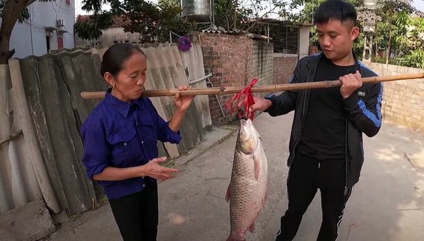 Đầu tiên, bà và Hậu - con trai út của mình đã tìm được một con cá trắm siêu to để làm clip hôm nay, phải hai người mới khiêng nổi đủ biết nó nặng cỡ nào.