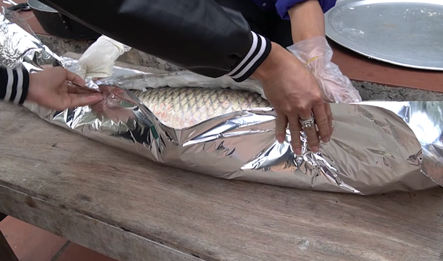 Cuối cùng, bà dùng hỗn hộp muối + lòng trắng trứng này bọn quanh con cá, sau đó dùng giấy bạc quấn lại và ủ trong than hồng khoảng một tiếng đồng hồ.