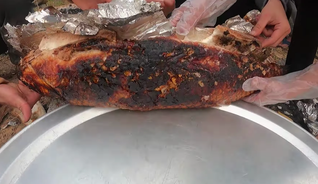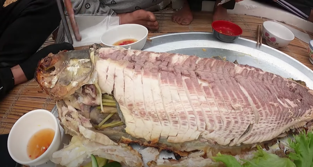Khi lấy ra xong, nhiều người còn không khỏi hoang mang thay cho bà Tân vì một nửa con cá đã cháy mất.
