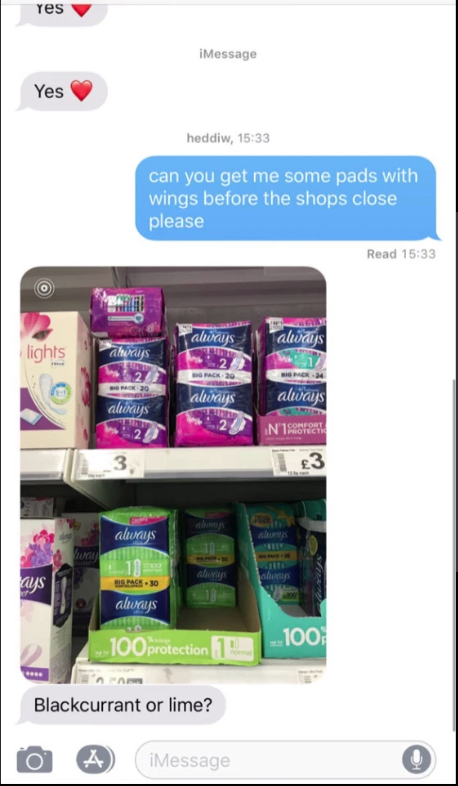 Nhưng bố Niamh lại khác, ông nhanh chóng lái xe đến cửa hàng tạp hóa để mua giúp con. Đứng trước lô lốc băng vệ sinh, ông bố này nhắn tin hỏi: