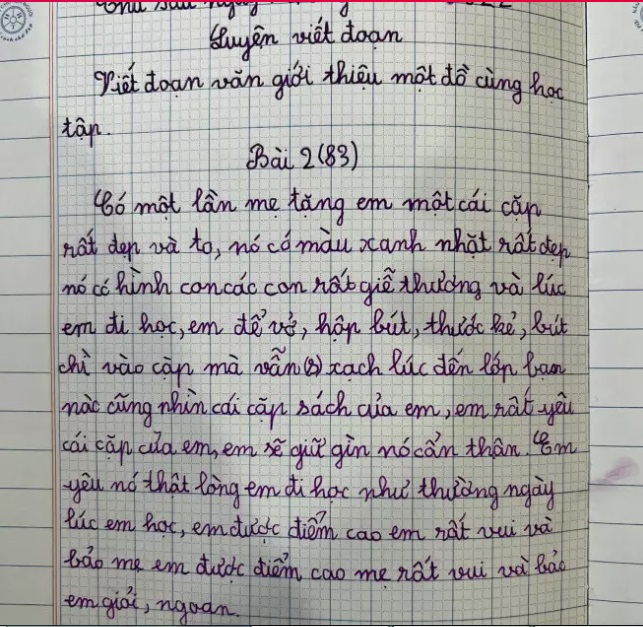 "Có lần mẹ tặng em một chiếc cặp sách rất đẹp và to. Nó có màu xanh nhạt rất đẹp nó có hình các con rất 'giễ' thương và lúc em đi học, em để vở, hộp bút, thước kẻ, bút chì vào cặp mà vẫn 'xạch'. Lúc đến lớp bạn nào cũng nhìn cái cặp sách của em, em sẽ giữ gìn nó cẩn thận.