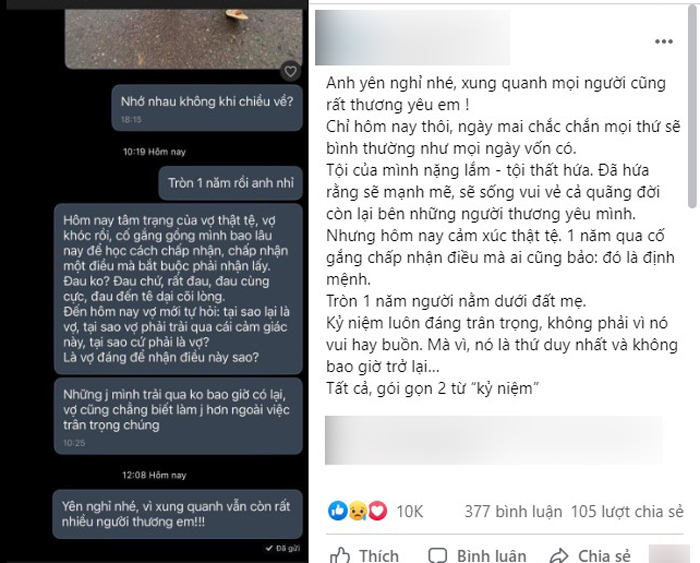 "Tròn 1 năm rồi anh nhỉ, hôm nay tâm trạng của vợ thật tệ. Vợ khóc rồi, cố gắng gồng mình bao lâu nay để học cách chấp nhận, chấp nhận một điều bắt buộc phải nhận lấy.