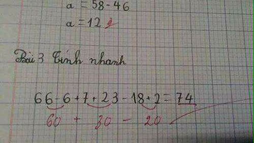 Theo đó, bài toán được cho như sau: 66 - 6 + 7 +23 - 18 + 2 = ? Trong hình ảnh chia sẻ, đáp án bài toán học sinh đưa ra là 74 với cách tính đơn thuần từ trái sang phải. Tuy nhiên trong chữ viết màu đỏ được cho là của cô giáo thì đã gạch sai đáp án này.
