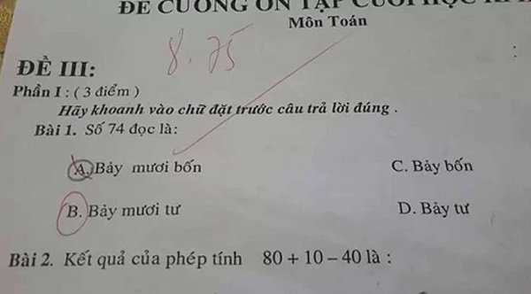 Theo hình ảnh được chia sẻ, học sinh chọn đáp án A nhưng giáo viên nói rằng sai và sửa thành đáp án B. Tức là, số 74 phải được đọc là "bảy mươi tư" chứ không phải "bảy mươi bốn".
