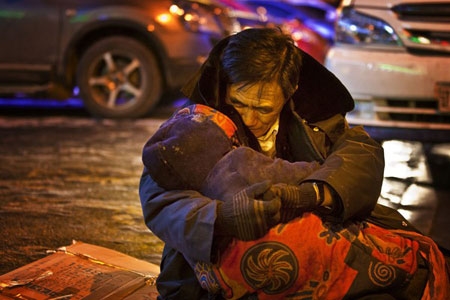 Một người đàn ông 63 tuổi trùm áo khoác để giữ ấm vợ ông, người đã chết vì một cơn đau tim đột ngột trên đường đi đến một hiệu thuốc ở Thẩm Dương, tỉnh Liêu Ninh, Trung Quốc, ngày 17 tháng 12, năm 2014. Ông từ chối không rời khỏi đó dù ông đã ngồi đó hơn nửa giờ với nhiệt độ ngoài trời là âm 17 độ C. "Hãy để tôi được ở bên cô lâu hơn một chút nữa trước khi xe tang đến", ông nghẹn ngào nói.