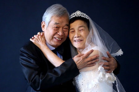 Ông Yu Gengxuan, 82 tuổi, và vợ Luo Lan, 80 tuổi, chụp ảnh cưới "Khi chúng tôi kết hôn, chúng tôi thậm chí không có một bức ảnh và cũng chẳng nhẫn cưới. Chúng tôi đã làm việc xa nhau gần 20 năm. Vào ngày 16 tháng 3 sắp đến, kỷ niệm ngày cưới lần thứ 60, tôi sẽ tặng bà ấy một chiếc nhẫn", Yu nói.