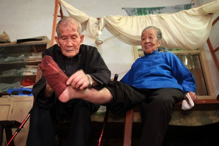 Bà Wu Songkun 103 tuổi bị thương ở chân, và người chồng Wang Pengpeng 104 tuổi, giúp bà xoa bóp, đi tất chân. Họ đã kết hôn 73 năm.