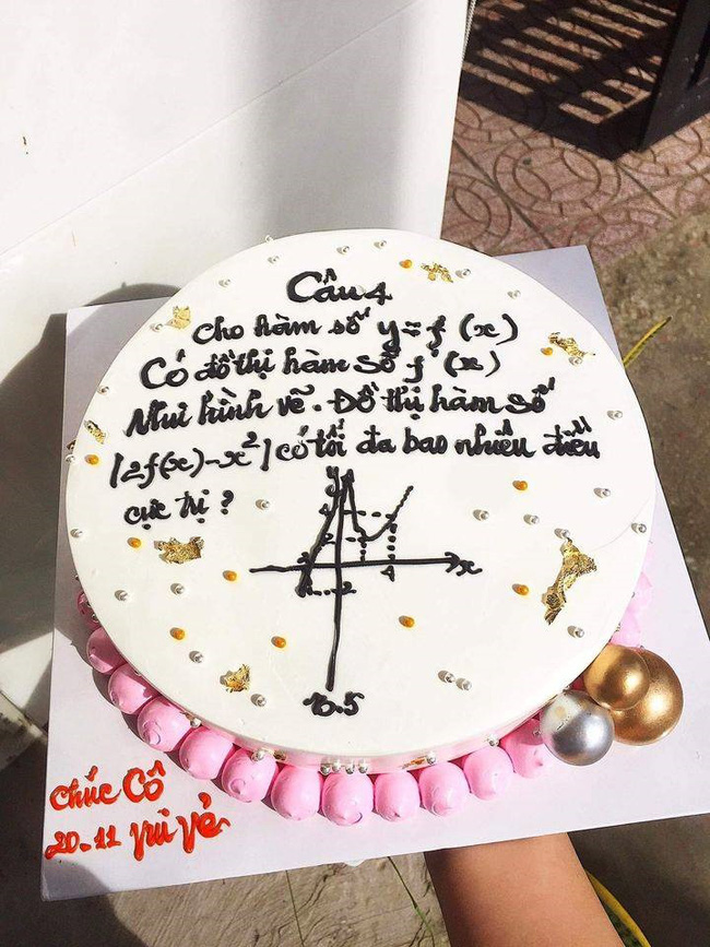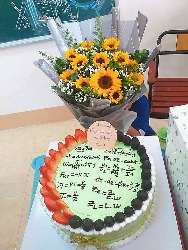 Tuy nhiên, với nhiều cô cậu học trò thì hoa quà có lẽ chưa đủ gây xúc động, nên một ý tưởng mới hay ho đã xuất hiện làm ngày 20/11 trở nên đáng nhớ vô cùng. Đó là những chiếc bánh kem được trang trí bằng... các công thức toán học, vật lý, hình học, thậm chí cả hóa học khiến ai trông thấy cũng hoa mắt giật mình. Có lẽ học hành trên lớp quá căng thẳng nên lũ học trò nghịch ngợm đã nghĩ ra cách này để giúp thầy cô giải tỏa stress chăng?