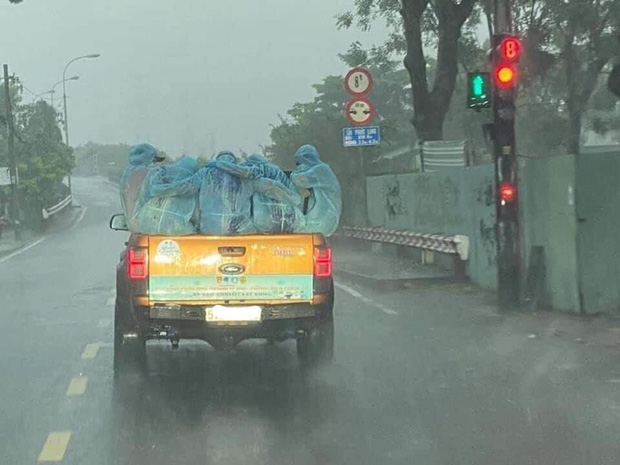 Hình ảnh do bạn L.H.T. chia sẻ về những người "chiến sĩ" áo xanh làm nhiệm vụ xịt khử khuẩn lưu động tại TP.HCM ngồi trên thùng xe bán tải, không có bất cứ gì che chắn dưới cơn mưa lớn đã thu hút được sự chú ý của nhiều người.