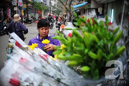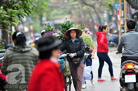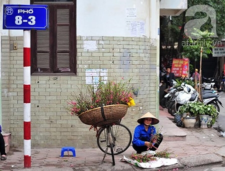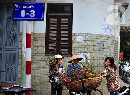 Đã là cuối tháng Giêng nhưng hoa đào vẫn còn nở rộ. Ta dễ dàng bắt gặp những xe chở hàng rong nép mình trong góc phố, bên trên đầy ắp các thúng hoa đào, hoa cúc, hoa ly...nồng đượm sắc xuân ấm áp, khiến ai nhìn thấy cũng muốn sà vào, rồi ôm một bó hoa nhỏ xinh về cắm trước ngày mùng Một tháng 2 âm lịch. |
