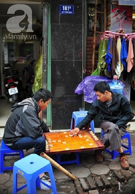 Gần đó là một bàn cờ tướng với 2 cốc trà đá, đôi bạn tóc hoa râm ngồi vừa trò chuyện vừa chậm rãi chơi cờ sáng đầu tuần. |