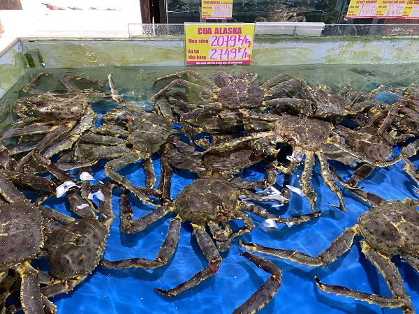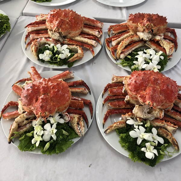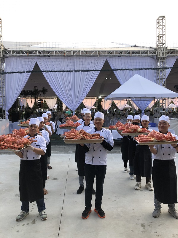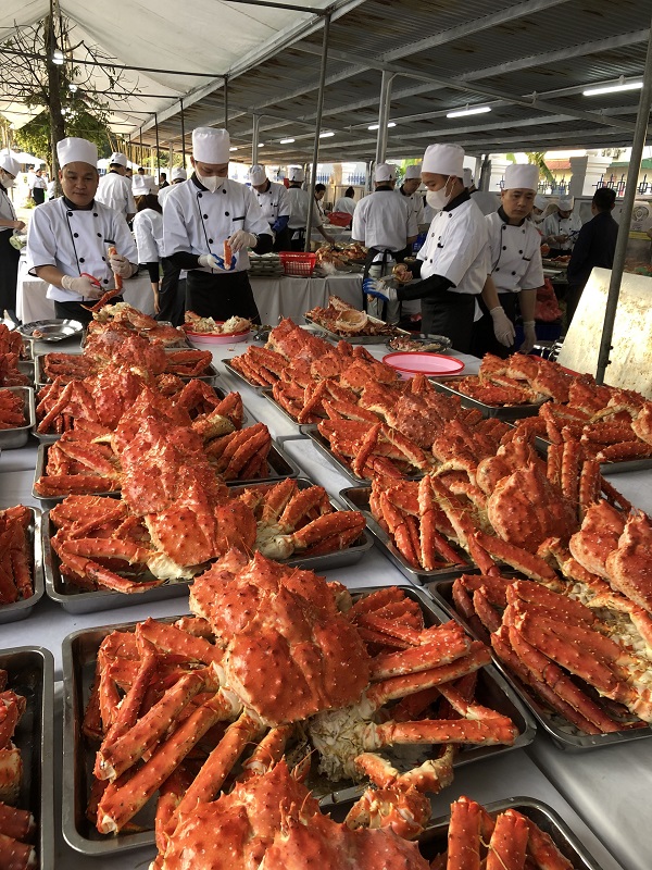 Để phục vụ tốt nhất cho tiệc cưới cực 'khủng' với số lượng khách mời lên tới 1500 khách, nhà hàng Hải sản Biển Đông đã phải chuẩn bị vô cùng kỹ lưỡng. Khâu nhập các nguyên liệu đắt đỏ như cua Alaska, bào ngư... tiếp tục được chọn lọc hết sức cẩn thận, đảm bảo tiêu chuẩn khắt khe của nhà hàng. Đây đều là những loại hải sản hảo hạng, được nhập khẩu từ nước ngoài với giá đắt đỏ. Cụ thể, cua hoàng đế (hay còn gọi cua Alaska) được nhập khẩu từ Alaska (Bắc Mỹ), giá 2.079.000 đồng/kg; bào ngư được nhập khẩu từ Hàn Quốc, giá 85.000 đồng/con. Dù không tiết lộ mức giá cụ thể cho từng mâm cỗ nhưng nhà hàng này cho biết, đây là thực đơn đám cưới hạng sang. Bình quân mỗi con cua hoàng đế tại tiệc cưới này nặng 3kg.