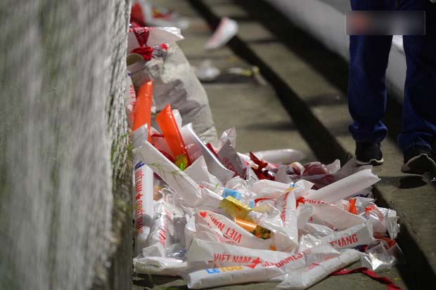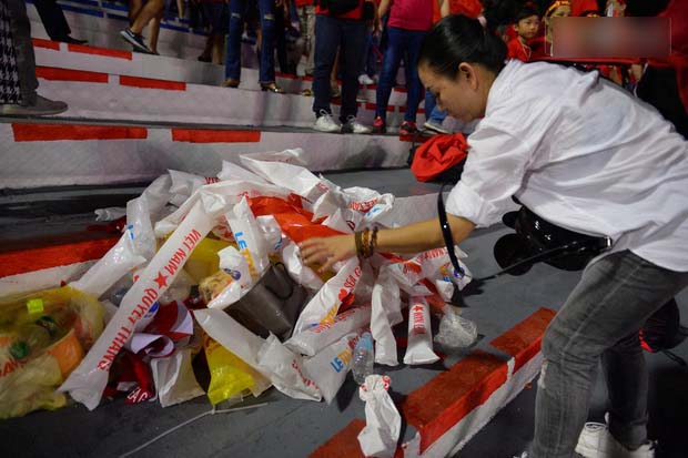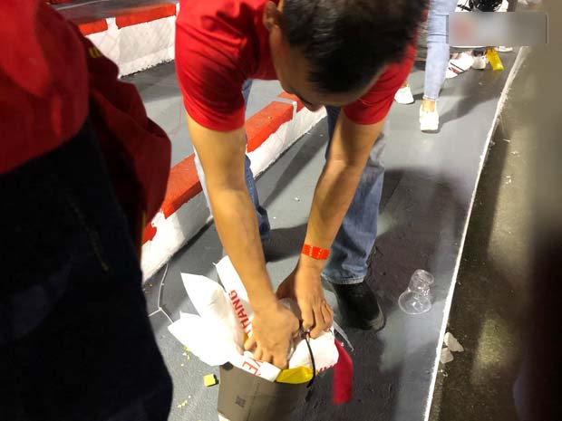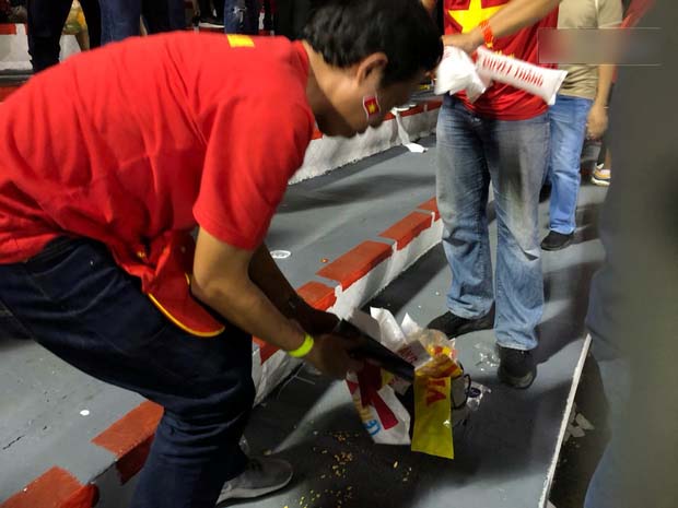 Sau trận đấu, hầu hết người đều nhanh chóng ùa ra đường để ăn mừng, nhưng trước đó, không ít CĐV Việt Nam đã nán lại khán đài để thu gom rác và túi nilon vương lại trên các hàng ghế.