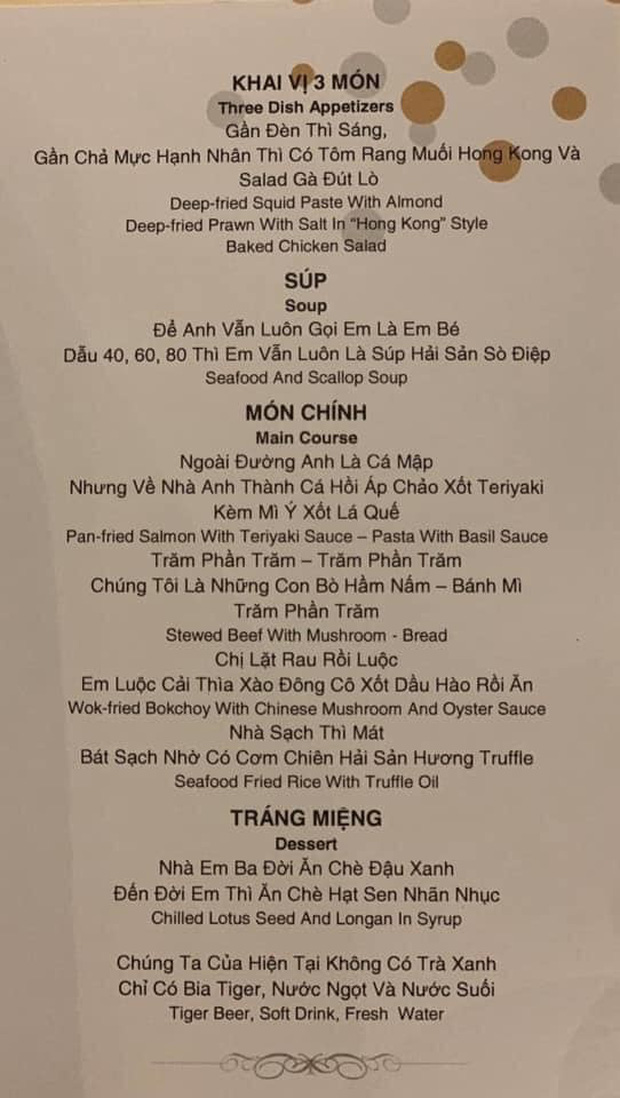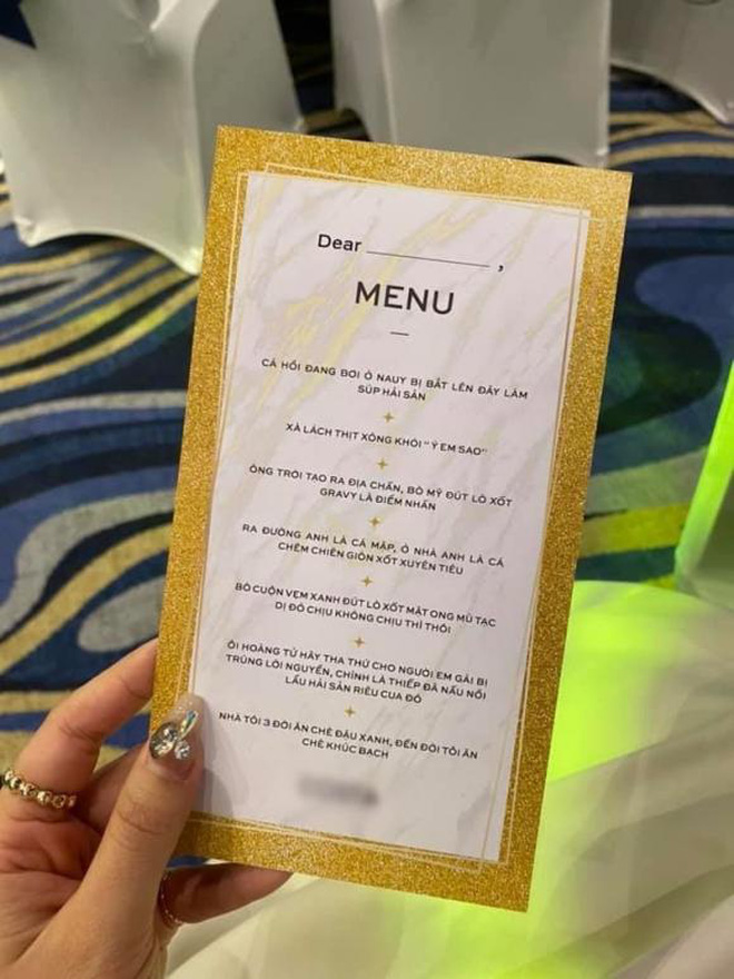 Sau đây là một vài chiếc menu tiệc cưới cực sáng tạo, bắt đủ thứ trend trên trời đã viral gần đây:
