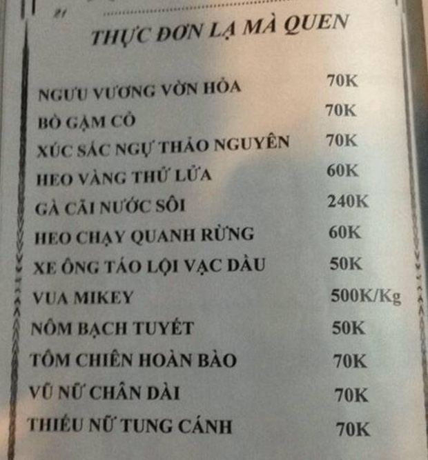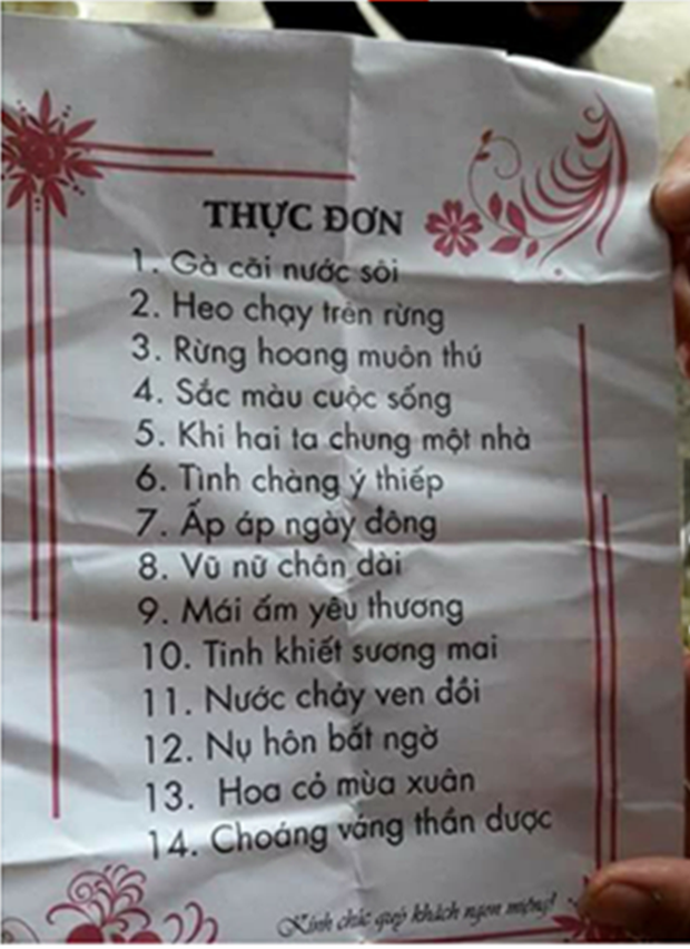 Một chiếc menu đổi tên món ăn khác để "đánh đố" khách, phải tư duy kỹ lắm mới đoán ra được đủ các món đó nha!