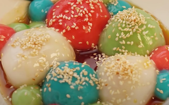 Chè trôi nước tuy đơn giản nhưng cũng không thể thiếu trong ngày này. Những viên chè tròn được làm từ bột nếp trắng, bên trong nhân đậu xanh, ăn cùng với nước cốt dừa béo.