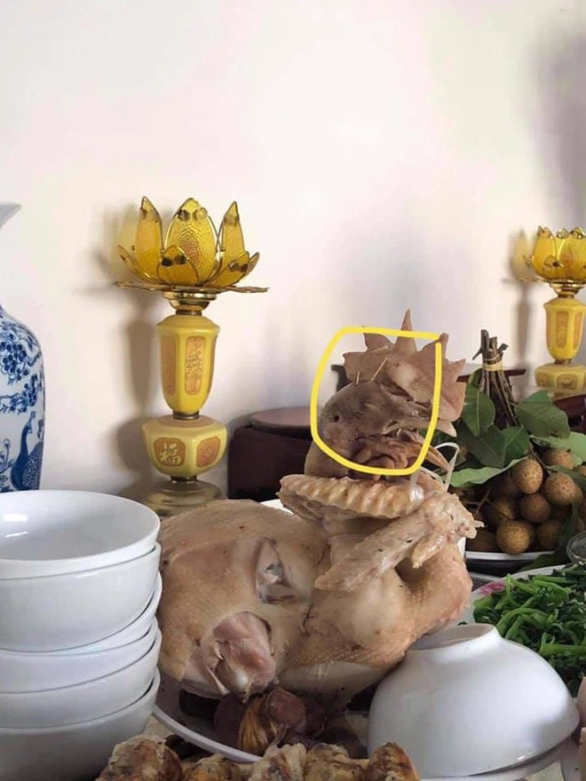 Nhờ chồng luộc hộ con gà để cúng nhưng tới lúc dọn lên mâm, cô vợ muốn "suy nhược" với thành phẩm bị rớt mất cái mào. Thế là anh chồng liền "chữa cháy" bằng cách... dùng tăm gắn lại vào đầu con gà!
