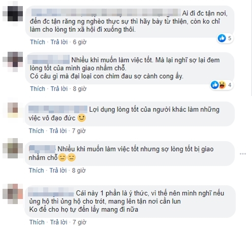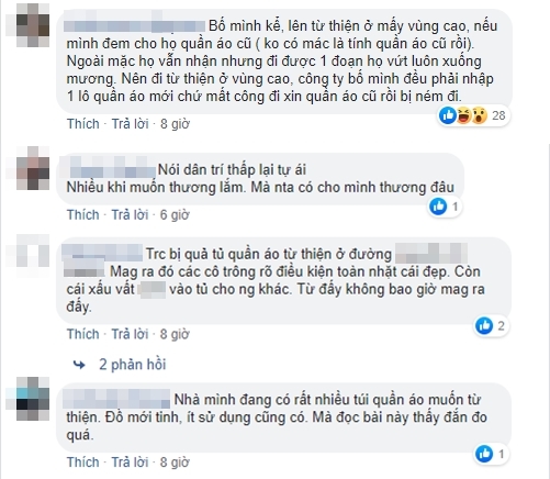 Nhiều lúc tự bỏ tiền thuê taxi, xe ôm chở quần áo về, bao trẻ em, người nghèo ở quê tôi còn chẳng đủ quần áo mà mặc... mà giờ họ lại làm thế. Nhận thức quá kém cỏi, quá vô văn hoá, lừa dối, lừa đảo, lấy mất phần của người nghèo khác…”.