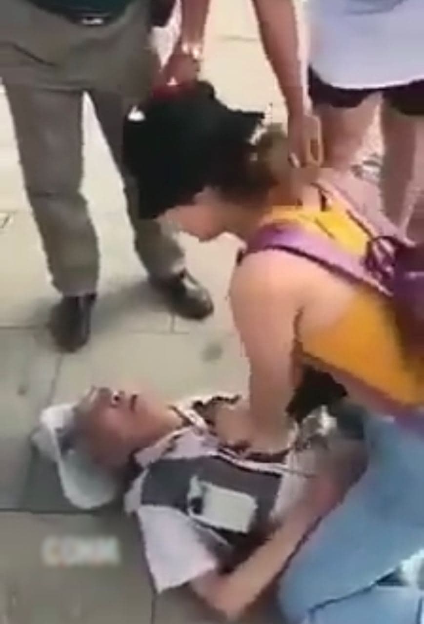 Cụ thể, cụ ông đã ngất xỉu bất ngờ ở bên ngoài sân bay khiến đám đông hoảng hốt bối rối. Những người đứng xung quanh vội vã gọi điện thoại tìm xe cấp cứu đưa nạn nhân đến bệnh viện, một nữ du khách trẻ tuổi đứng gần đó đã lập tức quăng điện thoại và ngồi xuống làm động tác hồi sức tim phổi một cách chính xác, nhanh nhẹn. Vừa dùng 2 tay ấn lồng ngực cho cụ ông, cô gái vừa làm cả hô hấp nhân tạo.