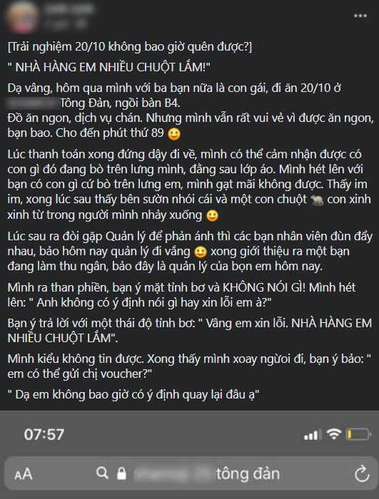 Trong bài viết cô gái kể, "đồ ăn ngon, dịch vụ chán, nhưng mình vẫn rất vui vẻ vì được ăn ngon, bạn bao. Cho đến phút thứ 89, lúc thanh toán xong đứng dậy đi về, mình có thể cảm nhận được có con gì đó đang bò trên lưng mình, đằng sau lớp áo. Mình hét lên với bạn có con gì cứ bò trên lưng em, mình gạt mãi không được. Thấy im im, xong lúc sau thấy bên sườn nhói cái và một con chuột con xinh xinh từ trong người mình nhảy xuống.