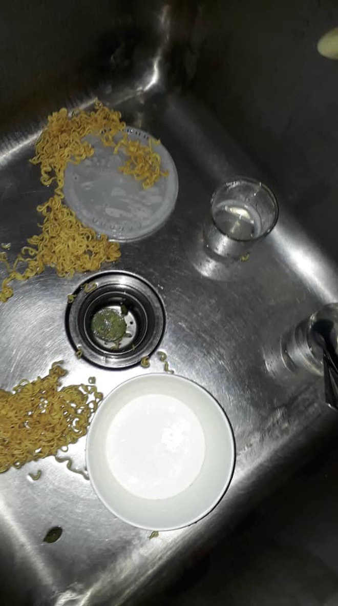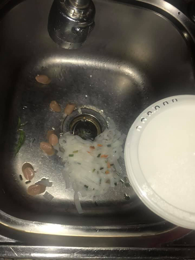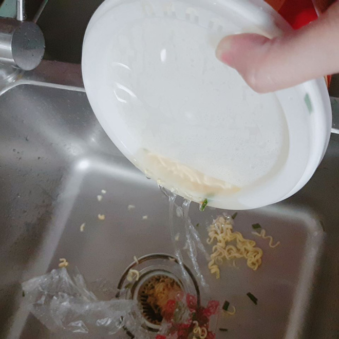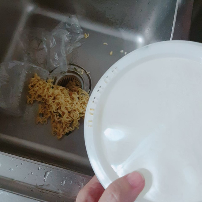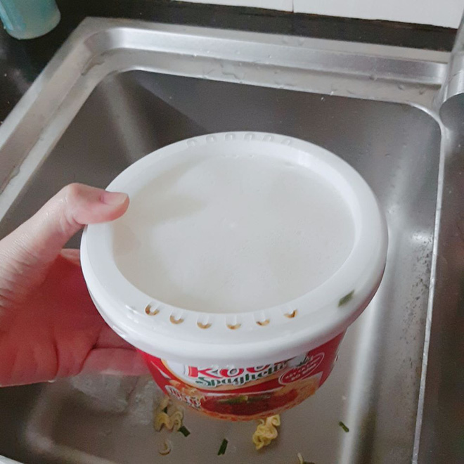 Do chủ quan phần nắp hộp mì có những lỗ nhỏ để người dùng dễ chắt nước ra mà chủ thớt đã làm rơi luôn cả phần mì xuống bồn rửa chén.