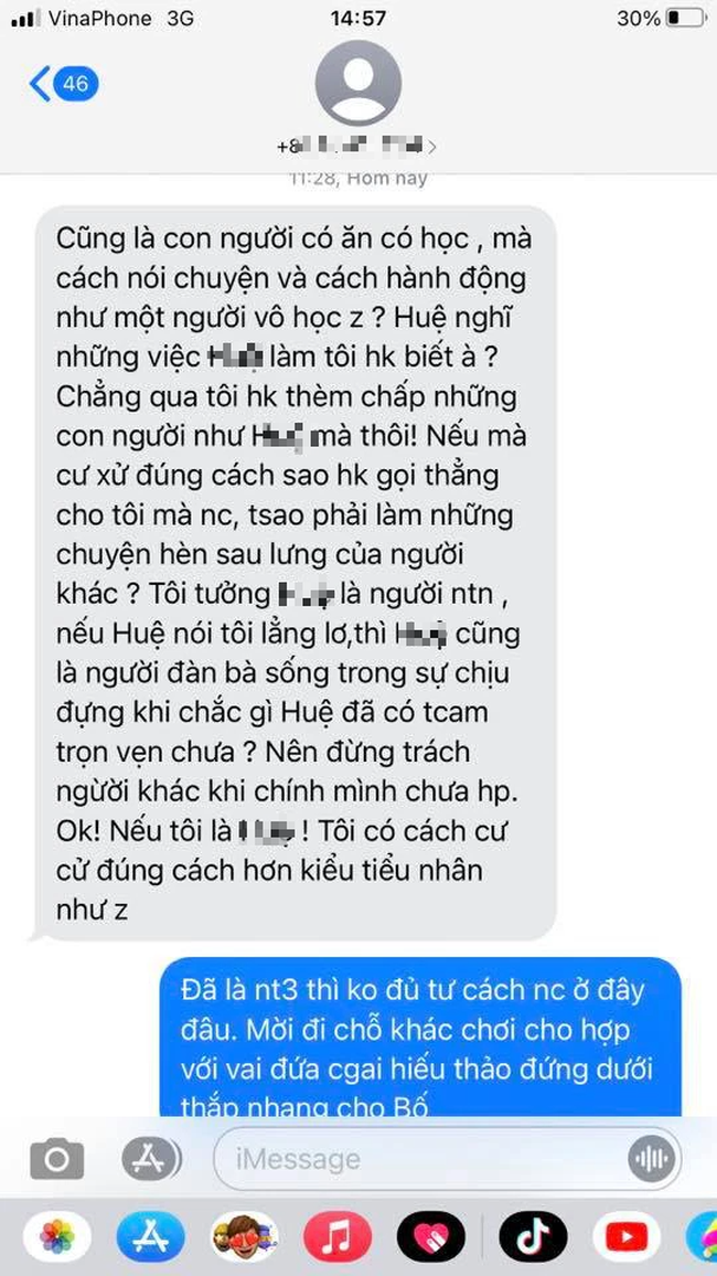 "Cũng là người có ăn có học mà cách hành động và nói chuyện như 1 người vô học? H. nghĩ những việc H. làm tôi không biết à? Chẳng qua tôi không thèm chấp những con người như H. thôi. Nếu cư xử đúng cách sao không gọi thẳng cho tôi mà nói chuyện, tại sao phải làm chuyện hèn sau lưng người khác. Tôi tưởng H. là người thế nào, nếu H. nói tôi lẳng lơ thì H. cũng là người đàn bà sống trong sự chịu đựng khi chắc gì H. đã có tình cảm trọn vẹn chưa? Nên đừng trách người khác khi chính mình chưa hạnh phúc. Ok nếu tôi là H., tôi có cách cư xử đúng cách hơn tiểu nhân như vậy", tiểu tam "dạy đời" chính thất.