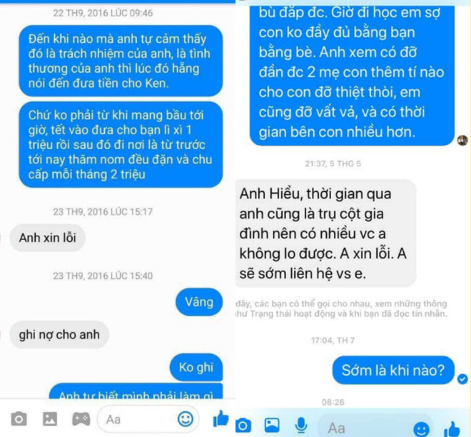 "Điều đó hoàn toàn không có thật, mình nhắn tin nói thì anh ta xin lỗi, bảo ghi nợ giúp. Rồi mấy tháng trước mình lại nghe người ta bảo H. nói mình cắt hết các quyền của anh ta với thằng bé.