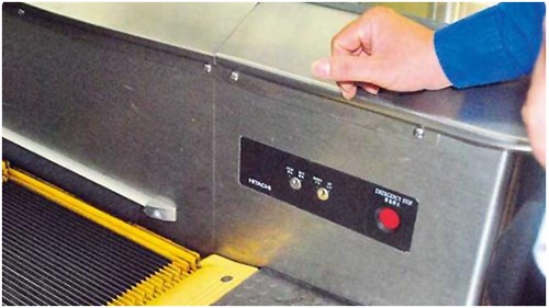 - Biết rõ vị trí của nút dừng khẩn cấp. Thông thường, nút dừng khẩn cấp được đặt vị trí ở đầu hoặc cuối thang cuốn, ở bên phải tay vịn. Hãy lưu tâm để có thể xử lý kịp thời khi phát hiện thang gặp sự cố.