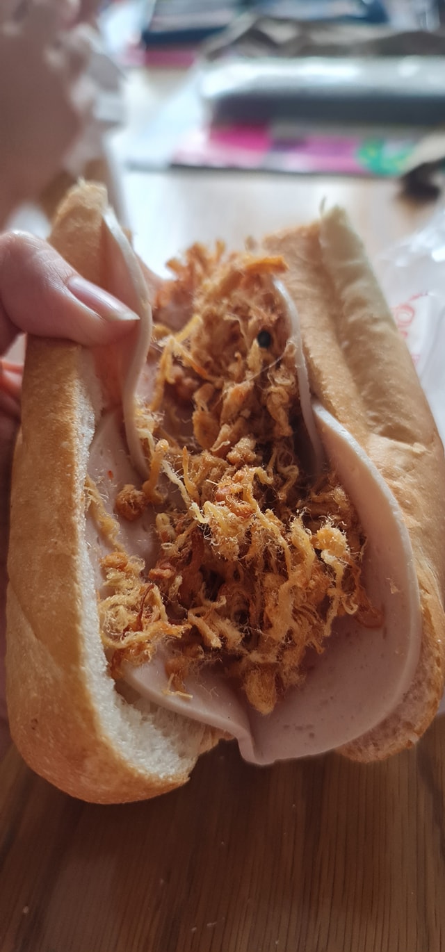 Các mẹ hãy nhìn hình ổ bánh mì của tui đi. Miếng chả mỏng hơn nữ hoàng nội y, còn bánh mì thì dai như da tui vậy huhu, vừa cắn xé kéo vừa rơi nước mắt... Ăn xong hết dám tiêu hóa luôn. Kết quả là tới sáng hôm nay tui vẫn chưa dám ăn thêm món gì vì sợ nó trôi mất bánh mì".