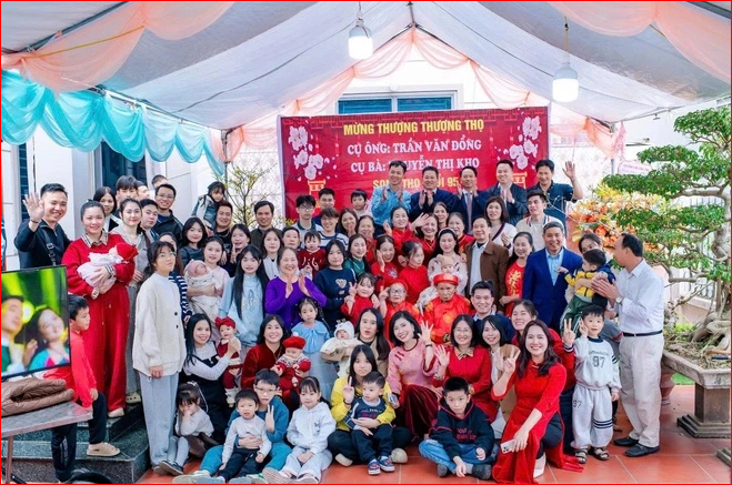 Khoảng 14h ngày 24/2, tức mùng 5 Tết, sân vận động trong thôn ở Phú Thọ rộn ràng tiếng cười khi đại gia đình của cụ ông Trần Văn Đổng và cụ bà Nguyễn Thị Kho tập trung chụp ảnh đầu xuân. Gần 200 người thuộc nhiều thế hệ đứng kín một góc sân, tạo thành một bức tranh đông đúc hiếm thấy giữa làng quê đầu năm.