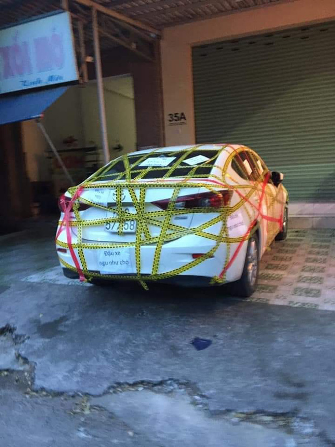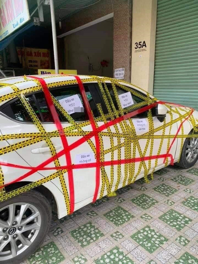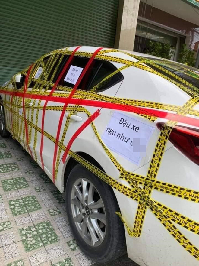 Dĩ nhiên, khi quay lại, chủ xe sẽ giật mình vì bộ dạng mới của chiếc ô tô. Những dải băng dính vàng và đỏ được dán chằng chịt như muốn niêm phong chiếc xe. Chưa hết, hàng chục tờ giấy trắng, in dòng chữ nổi bật dán trên ô tô có ý nhắm thẳng vào ý thức của chủ xe.