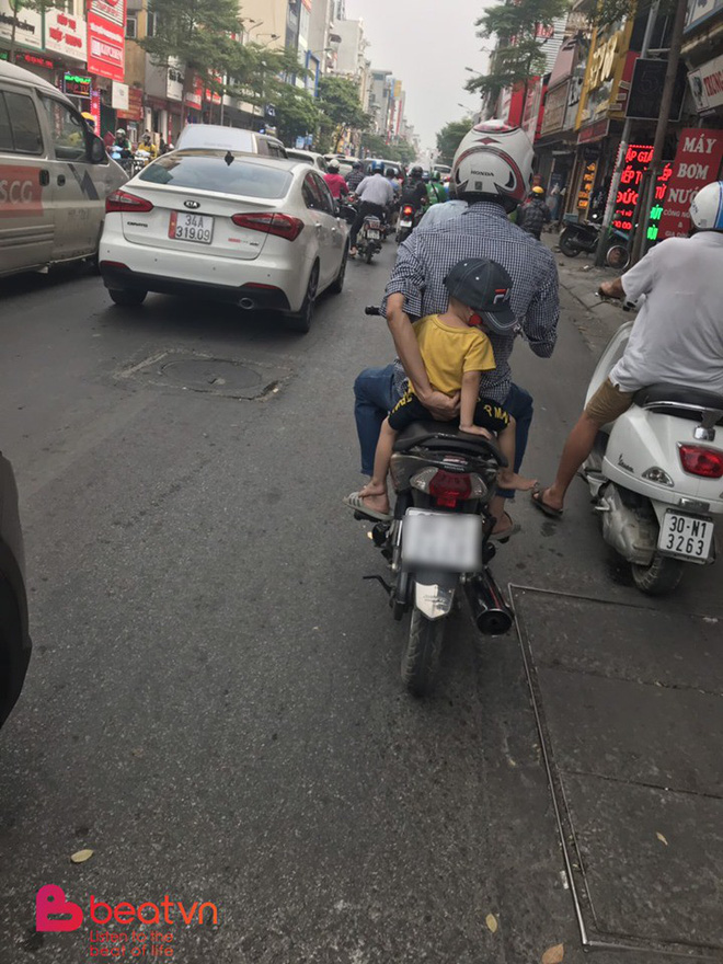 Đây là câu chuyện do một diễn đàn đăng tải. Ông bố một tay lái xe, tay còn lại giữ sau lưng cậu con trai nhỏ đang bị ốm ngồi phía sau. Nhìn hình ảnh hai bố con di chuyển khó khăn và nguy hiểm, ai cũng xót xa, lo lắng.