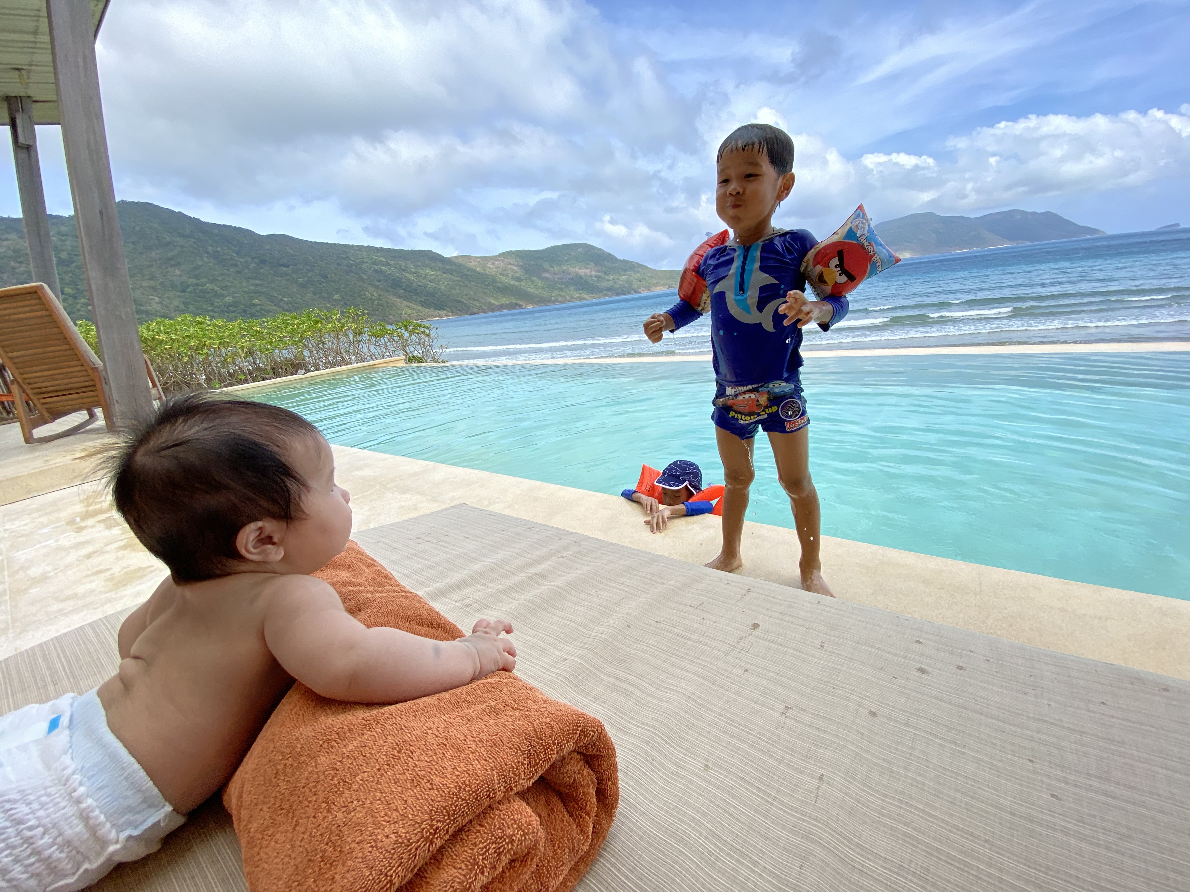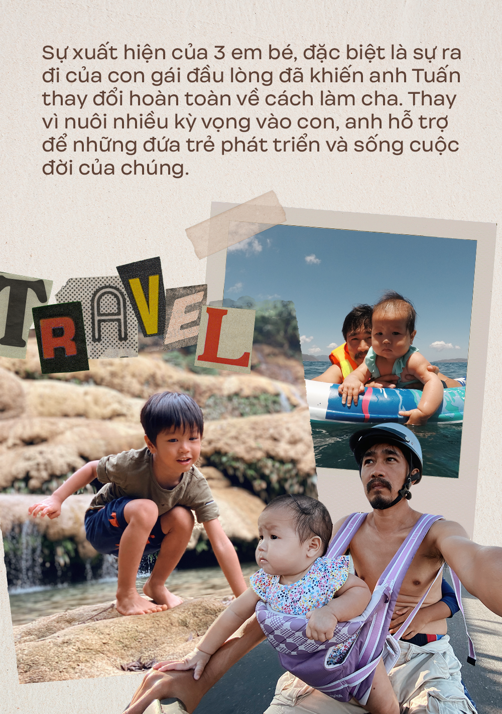 Càng yêu chúng, anh càng thích tha chúng đi chơi, luôn vẽ ra các tour khám phá, trải nghiệm cho con, cố gắng tạo cho con sức đề kháng tự nhiên nhiều nhất có thể, thay vì o bế ở nhà cùng nỗi sợ hãi. Cô Bu chắc cần nhiều hơn thời gian để thẩm thấu. Còn cậu Dê với nước da đen nhánh, rắn rỏi thì trưởng thành hơn so với tuổi lên 5. Dê có thể cởi trần ở bãi biển chơi cả ngày, chỉ cần biết bố ngồi đâu để chạy về. Có thể chỉ ăn một cái bánh mì không, một nắm xôi dọc đường là đủ năng lượng nghịch cả buổi. Có thể hòa nhập nhanh và biết cách giao tiếp với vốn từ phong phú, biết bày trò chơi cùng trẻ con khác… Anh Tuấn tự thấy thế là đủ.