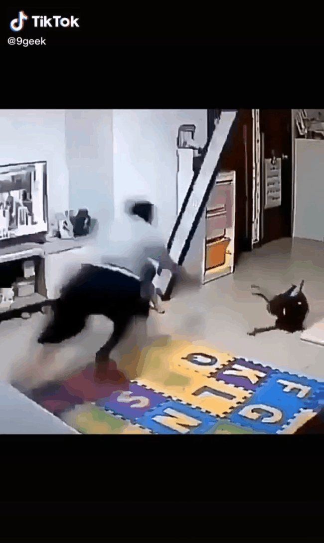 Thế nhưng tình huống bất ngờ xảy ra khi một bé va phải cái gương dựng trên tường và tấm gương chuẩn bị rơi xuống bé còn lại. Nhanh như cắt, người bố trượt dài trên sàn để đỡ lấy chiếc gương trong khi người mẹ có vẻ vẫn chưa "load" kịp tình hình.