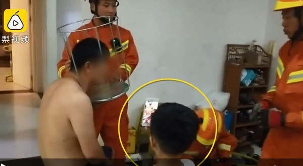 Điều đặc biệt, trong quá trình giải cứu, đứa con trai nhỏ không những không lo lắng cho bố mà con lấy điện thoại quay lại gương mặt bối rối và đáng thương của bố.