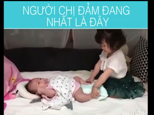 Đây chính là người chị đảm đang trong truyền thuyết khi thay tã cho em vô cùng thuần thục